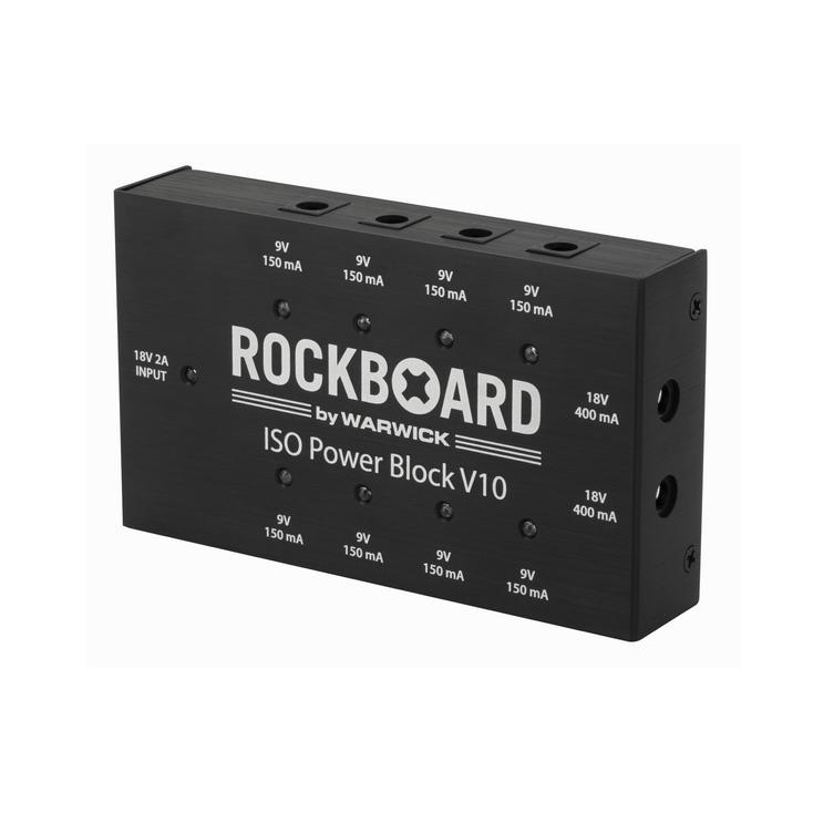 The RockBoard ISO Power Block V10 is a multi power supply fort effects pedalsthat offers 10 transformer isolated and highly filtered power slots – 8 x 9 volts (isolated) with a max. current output of 150 mA each, und 2 x 18 volts (isolated) with a max. current out put of 400 mA each – for separately powering a total of up to 10 effects pedals simultaneously without any noise. The advanced filtering technology used in each of the power slots prevents high frequency noise. Through individual short circuit protection for each slot, connected effects pedals are effectively protected in case of a short circuit. Individual LEDs indicate short circuits for each of the 9V outputs. In case of a short circuit, only the affected slot is being turned off, so undesturbed use of the rest of the effects pedals is guaranteed.